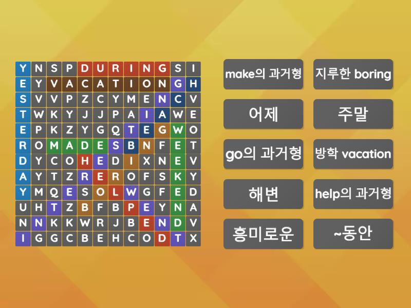 weekend - 주말, interesting - 흥미로운, during - ~동안, yesterday - 어제, vacation - 방학 vacation, beach - 해변, boring - 지루한 boring, made - make의 과거형, went - go의 과거형, helped - help의 과거형,