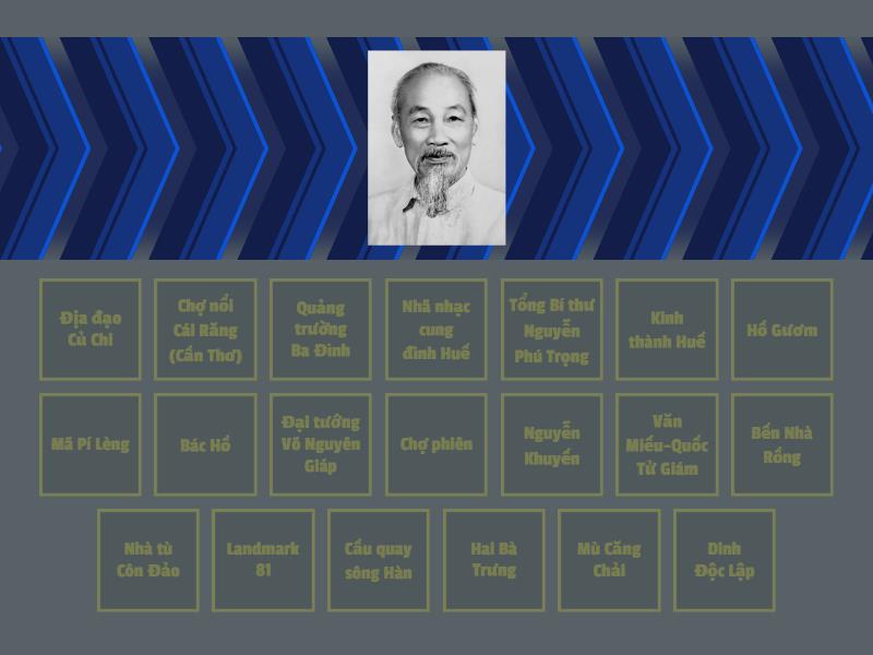 Bác Hồ, Hai Bà Trưng, Hồ Gươm, Đại tướng Võ Nguyên Giáp, Nguyễn Khuyến, Tổng Bí thư Nguyễn Phú Trọng, Dinh Độc Lập, Bến Nhà Rồng, Địa đạo Củ Chi, Quảng trường Ba Đình, Nhà tù Côn Đảo, Chợ nổi Cái Răng (Cần Thơ), Văn Miếu-Quốc Tử Giám, Kinh thành Huế, Cầu quay sông Hàn, Mã Pí Lèng, Mù Căng Chải, Nhã nhạc cung đình Huế, Chợ phiên, Landmark 81,