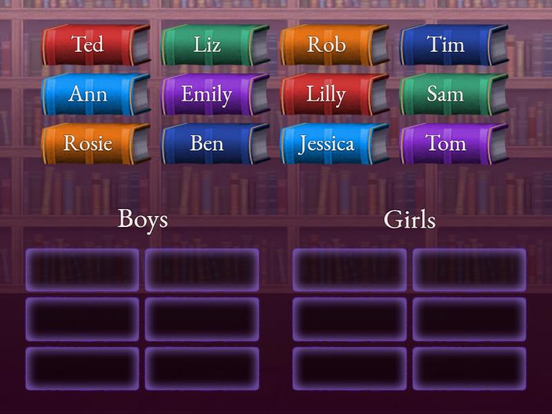 Boys: Tom, Rob, Tim, Sam, Ben, Ted, Girls: Ann, Liz, Emily, Lilly, Rosie, Jessica,