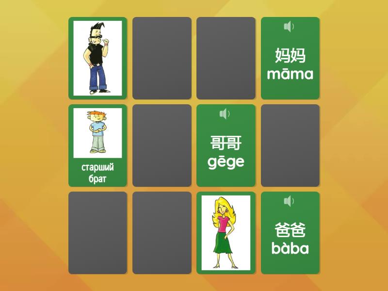 妈妈 māma, 爸爸 bàba, 哥哥 gēge - старший брат, 姐姐 jiějie - старшая сестра, 弟弟 dìdi - младший брат, 妹妹 mèimei - младшая сестра,