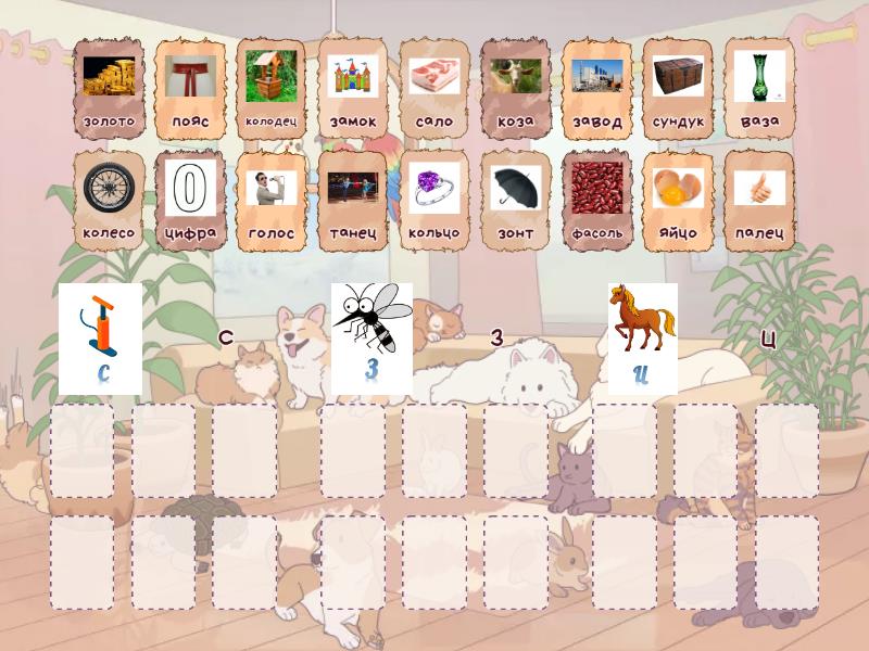 С: сундук, сало, фасоль, колесо, пояс, голос, З: замок, завод, золото, зонт, ваза, коза, Ц: цифра, яйцо, кольцо, палец, колодец, танец,
