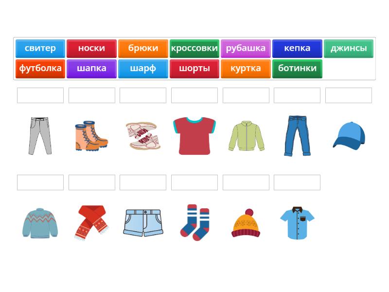 футболка, шорты, джинсы, брюки, рубашка, носки, кроссовки, шапка, кепка, шарф, куртка, свитер, ботинки,
