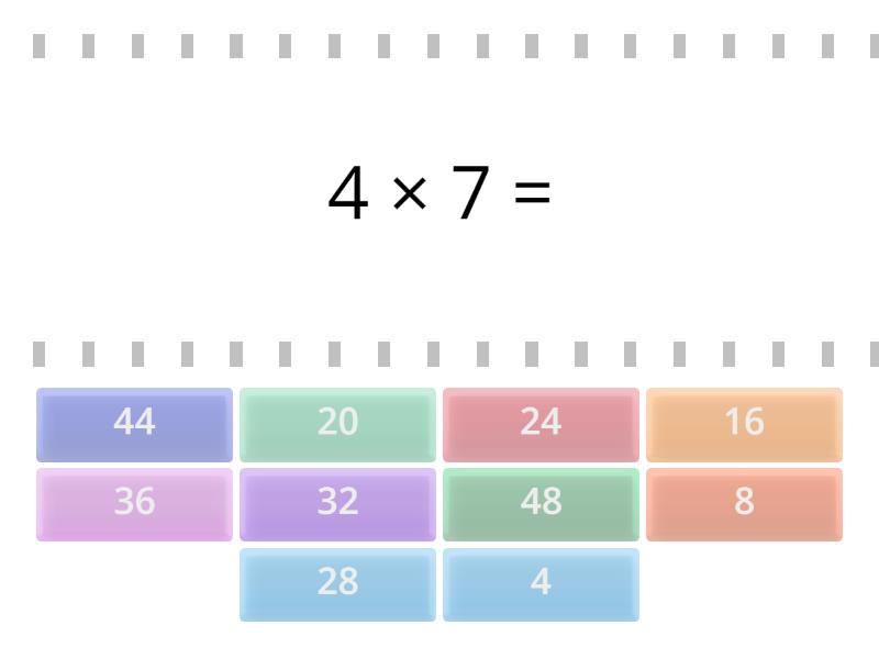 28 - 4 × 7 =, 24 - 4 × 6 =, 16 - 4 × 4 =, 48 - 4 × 12 =, 36 - 4 × 9 =, 44 - 4 × 11 =, 20 - 4 × 5 =, 8 - 4 × 2 =, 32 - 4 × 8 =, 4 - 4 × 1 =,