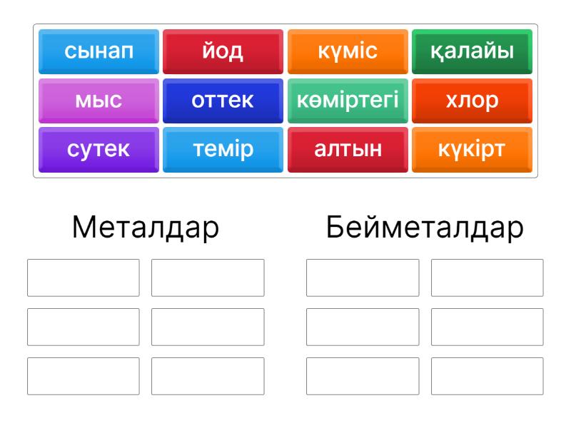 Металдар: темір, мыс, алтын, сынап, қалайы, күміс, Бейметалдар: күкірт, йод, оттек, сутек, көміртегі, хлор,
