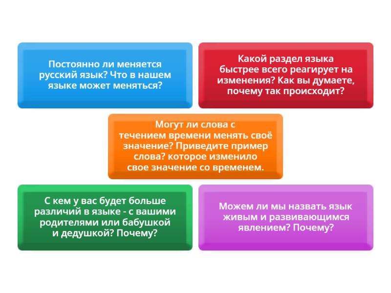 Можем ли мы назвать язык живым и развивающимся явлением? Почему?, Постоянно ли меняется русский язык? Что в нашем языке может меняться? , С кем у вас будет больше различий в языке - с вашими родителями или бабушкой и дедушкой? Почему? , Могут ли слова с течением времени менять своё значение? Приведите пример слова? которое изменило свое значение со временем., Какой раздел языка быстрее всего реагирует на изменения? Как вы думаете, почему так происходит? ,