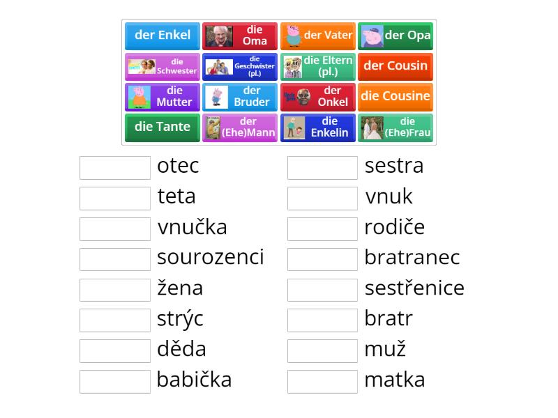 die (Ehe)Frau - žena, der (Ehe)Mann - muž, die Mutter - matka, die Schwester - sestra, die Oma - babička, die Tante - teta, die Cousine - sestřenice, die Enkelin - vnučka, die Geschwister (pl.) - sourozenci, der Vater - otec, der Bruder - bratr, der Opa - děda, der Onkel - strýc, der Cousin - bratranec, der Enkel - vnuk, die Eltern (pl.) - rodiče,