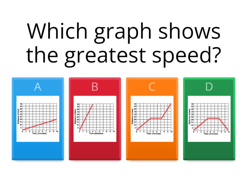 1) Which graph shows the greatest speed? a) b) c) d) 2) Which graph shows a slow, steady speed? a) b) c) d) 3) Which graph shows a steady speed, then stopped, then returning to the beginning? a) b) c) d) 4) Which line shows the racer starting ahead of everyone, but not moving? a) green line b) red line c) blue line d) none of them 5) At the end of 5 minutes, which racer was the farthest from the beginning? a) green line b) red line c) blue line d) all three of them 6) Which scenario matches the graph? a) running, then slowing down b) running, then stopped. c) running, stopped, then running back to the beginning d) running, then stopped, then continuing to run 7) Which graph shows someone slowing down to a stop? a) b) c) d) 8) Which graph shows someone speeding up? a) b) c) d) 9) Which graph shows a constant speed? a) b) c) d) 10) Which graph shows someone not starting at the starting line? a) b) c) d)