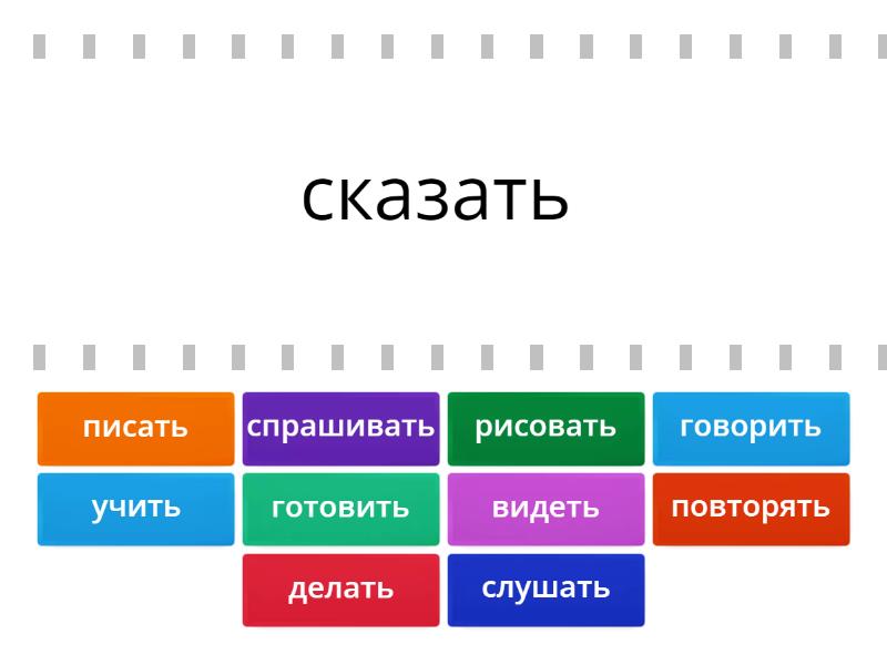 говорить - сказать, делать - сделать, писать - написать, рисовать - нарисовать, видеть - увидеть, слушать - послушать, готовить - приготовить, повторять - повторить, спрашивать - спросить, учить - выучить,