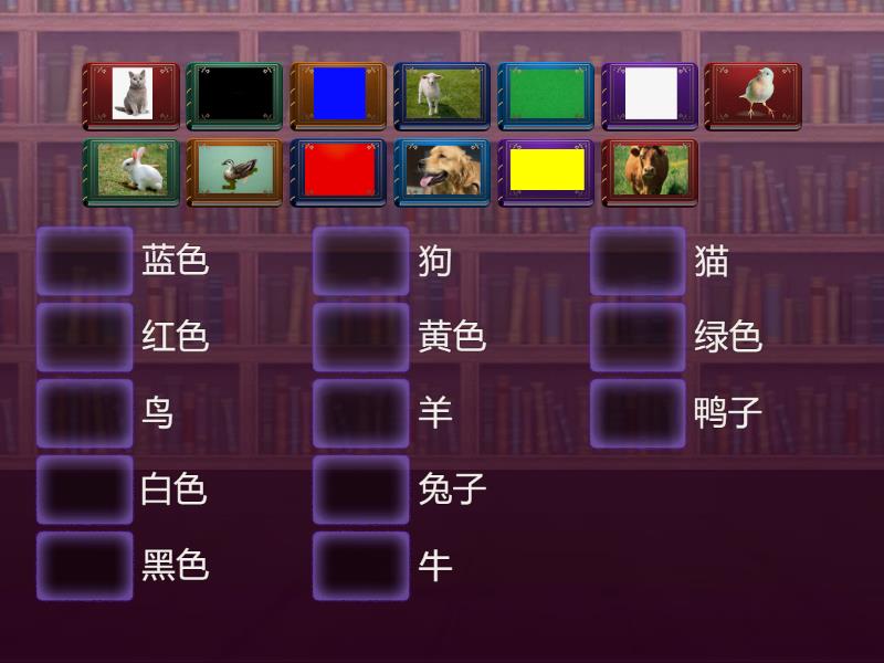 兔子, 猫, 狗, 牛, 羊, 鸟, 鸭子, 红色, 黄色, 绿色, 白色, 黑色, 蓝色,