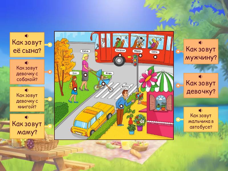 Как зовут маму?, Как зовут девочку?, Как зовут её сына?, Как зовут мужчину?, Как зовут мальчика в автобусе?, Как зовут девочку с собакой?, Как зовут девочку с книгой?.