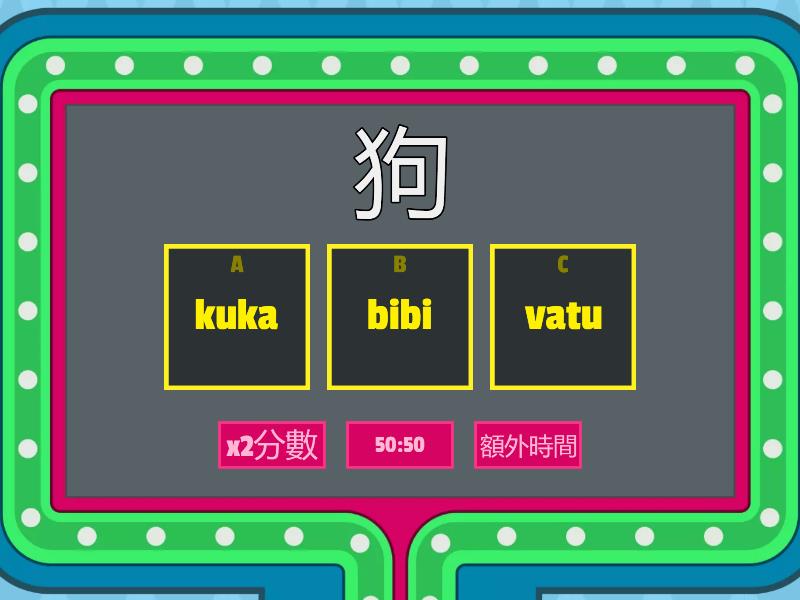1) 狗 a) kuka b) bibi c) vatu 2) ita a) 三 b) 五 c) 一 3) 有 a) azua b) izua c) aicu 4) aravac a) 非常 b) 是 c) 不是 5) 話 a) maca b) kai c) angalj 6) kilangda a) 說話 b) 看 c) 聽從 7) 黑色 a) 'ucengecengel b) 'udjidjilj c) vucelacelay 8) 'uljav a) 紅色 b) 顏色 c) 黑色 9) nia a) 你們的 b) 我們的 c) 他們的 10) sinikiljivak a) 不喜歡 b) 被疼愛的 c) 討厭的
