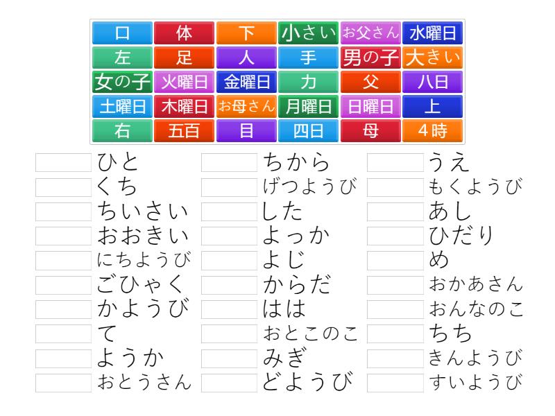 五百 - ごひゃく, 四日 - よっか, 八日 - ようか, 4時 - よじ, 月曜日 - げつようび, 火曜日 - かようび, 水曜日 - すいようび, 木曜日 - もくようび, 金曜日 - きんようび, 土曜日 - どようび, 日曜日 - にちようび, 男の子 - おとこのこ, 女の子 - おんなのこ, 人 - ひと, 父 - ちち, 母 - はは, お父さん - おとうさん, お母さん - おかあさん, 口 - くち, 目 - め, 手 - て, 足 - あし, 体 - からだ, 力 - ちから, 下 - した, 上 - うえ, 右 - みぎ, 左 - ひだり, 小さい - ちいさい, 大きい - おおきい,