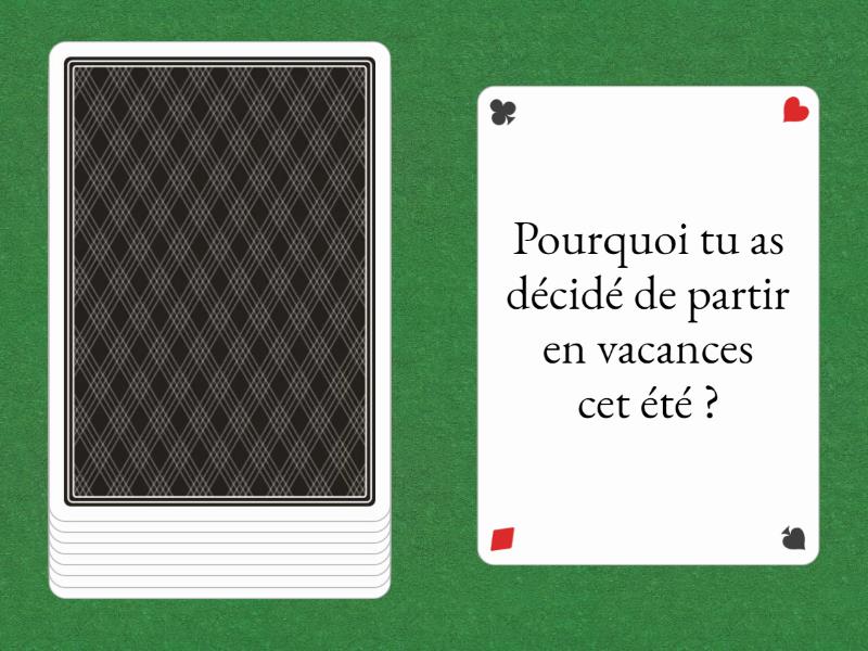 : Pourquoi tu as décidé de partir en vacances cet été ?, Pourquoi elle ne veut pas venir à la réunion ?, Pourquoi nous devons étudier ce sujet en classe ?, Pourquoi ils ont choisi de déménager dans une autre ville ?, Pourquoi tu as oublié de me téléphoner hier ?, Pourquoi il est toujours en retard au travail ?, Pourquoi vous avez changé de restaurant pour le dîner ?, Pourquoi elle aime cette chanson ? (cahnson = canção), Pourquoi nous avons besoin d'acheter ces fournitures scolaires ? (material escolar),