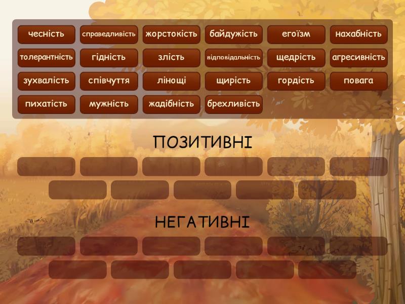 ПОЗИТИВНІ: справедливість, чесність, повага, гордість, щирість, відповідальність, співчуття, мужність, щедрість, толерантність, гідність, НЕГАТИВНІ: зухвалість, нахабність, злість, жорстокість, жадібність, брехливість, егоїзм, лінощі, пихатість, байдужість, агресивність,