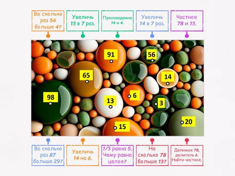 Делимое 78, делитель 6. Найти частное., Произведение 14 и 4., Увеличь 14 на 6., Частное 78 и 13., Увеличь 14 в 7 раз., На сколько 78 больше 13?, Увеличь 13 в 7 раз., Во сколько раз 56 больше 4?, 1/3 равна 5. Чему равно целое?, Во сколько раз 87 больше 29?.