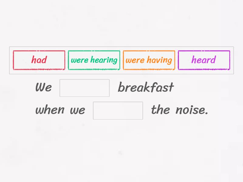 We ____ breakfast when we ____ the noise. We ____ a cake when we____ a spider on the floor. When we ____ outside we ____ the bear. The weather____ when we ____ the stars. Lily ____ on the phone when a truck ____ into her house. The burglar ____ when she ____ the police. Jamie ____ in the street when the cat ____ on him. While Jill ______________ was recording with the parrot, her brother _______ it at the same time. ____ ____ Last month, they _____________ to North Korea. Interesting choice of a holiday. ____ First, we _____________ the fire, then we _______________ screaming and later we _________________ that everyone was saved. ____ ____ ____