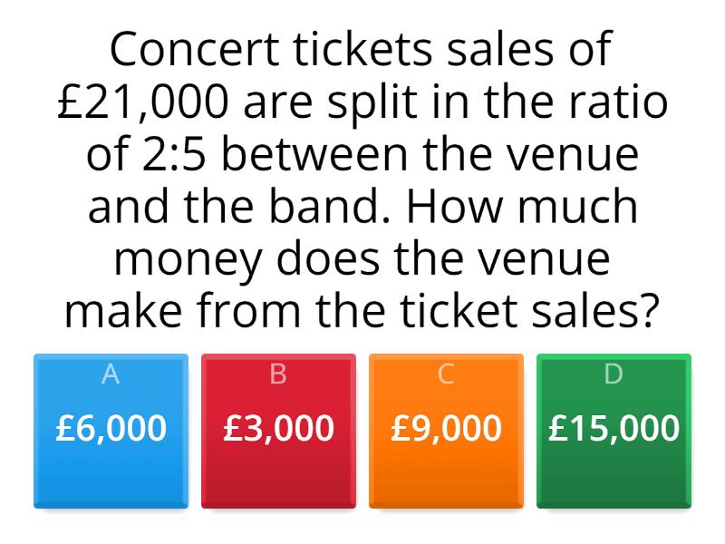 1) Concert tickets sales of £21,000 are split in the ratio of 2:5 between the venue and the band. How much money does the venue make from the ticket sales? a) £6,000 b) £3,000 c) £9,000 d) £15,000 2) £54,000 is split in the ratio of 1:3:8 between the venue, support band and the main band. How much money does the main band make? a) £36,000 b) £4,500 c) £13,000 d) £50,000 3) At an event, there needs to be at least 1 member of staff working for every 150 attendees. If there are 3000 attendees, how many staff will need to work? a) 20 b) 100 c) 15 d) 30 4) did you heck ?????? a) yes b) no c) maybe d) what is this e) uhhhhhhhhhhhhhhh f) i luv psg
