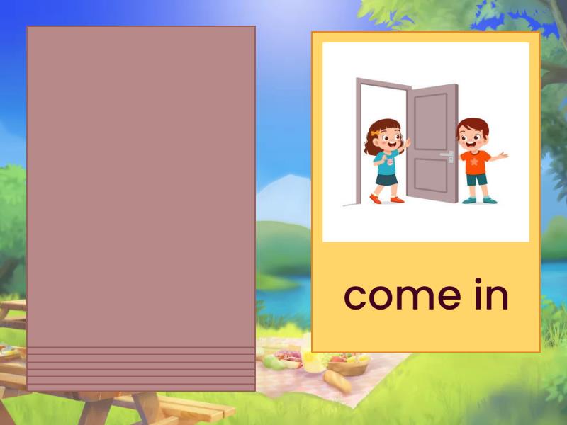 come in, sit down, stand up, open your book, close your book, listen, look , sing.