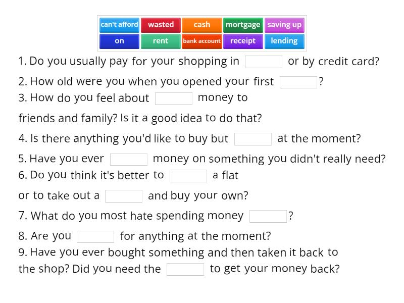 1. Do you usually pay for your shopping in ____ or by credit card? 2. How old were you when you opened your first ____? 3. How do you feel about ____ money to friends and family? Is it a good idea to do that? 4. Is there anything you'd like to buy but ____ at the moment? 5. Have you ever ____ money on something you didn't really need? 6. Do you think it's better to ____ a flat or to take out a ____ and buy your own? 7. What do you most hate spending money ____? 8. Are you ____ for anything at the moment? 9. Have you ever bought something and then taken it back to the shop? Did you need the ____ to get your money back?