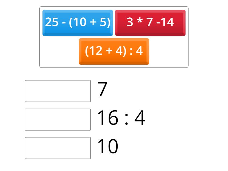 (12 + 4) : 4 - 16 : 4, 25 - (10 + 5) - 10, 3 * 7 -14 - 7,