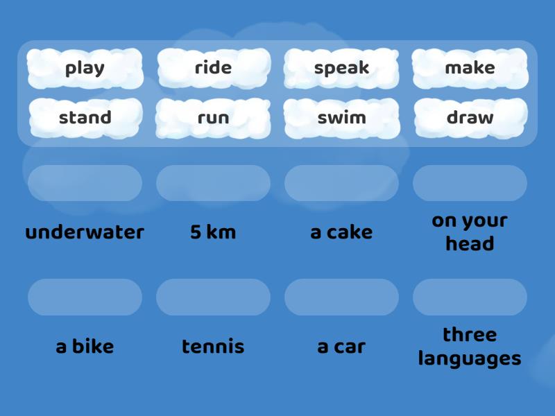draw - a car, make - a cake, play - tennis, ride - a bike, run - 5 km, speak - three languages, stand - on your head, swim - underwater,