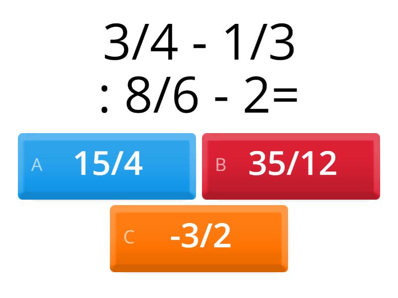 1) 3/4 - 1/3 : 8/6 - 2= a) 15/4 b) 35/12 c) -3/2 2) -3 . (-1/3) + 5/4 - 9/8= a) 15/4 b) 5/8 c) 3/7 3) 5/8 : 1/4+ 5/3. (1/2 - 1/4)= a) 35/12 b) 15/4 c) 43/30 4) (-4/3) . (- 6/5) + 1/4: (-3/2)= a) 35/12 b) 43/30 c) -3/2