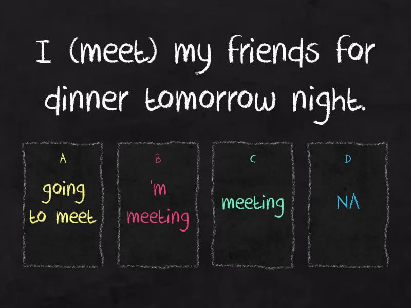 1) I (meet) my friends for dinner tomorrow night. a) going to meet b) 'm meeting c) meeting d) NA 2) I (buy) a new car next month. a) 'm going to buy b) 'm buying c) going to buy d) NA 3) My sister (get) married in June. a) getting b) is getting c) is goig to get d) NA 4) He (start) a new job on Monday. a) starting b) 's going to start c) 's starting d) NA 5) They (trave) to Europe next summer. a) travelling b) 're going to travel c) 're travelling d) NA 6) We (leave) for the airport at 6 AM. a) 're leaving b) going to leave c) leaving d) NA 7) She (wear) her new dress to the party. a) 's going to wear b) 's wearing c) wearing d) NA 8) The train (arrive) at 10 o'clock. a) is going to arrive b) arriving c) going to arrive d) NA 9) They (miss) the bus if they don't hurry up. a) are missing b) going to miss c) missing d) NA 10) He (be) a doctor when he grows up. a) 's going to be b) is being c) going to be d) NA 11) We (watch) a movie this evening. a) watching b) 're going to watch c) 're watching d) NA 12) The doctor (come) to visit my grandmother tomorrow. a) 's coming b) coming c) 're going to come d) NA 13) It (be) a difficult exam. a) 's being b) 's going to be c) going to be d) NA 14) We (have) a barbecue on Saturday afternoon. a) 're going to have b) having c) going to have d) NA 15) I (call) you later. a) 'm going to call b) calling c) 'm calling d) NA 16) Our team (play) a match on Sunday. a) is going to play b) going to play c) playing d) NA 17) The dentist (see) me at 3 PM on Tuesday a) is going to see b) is seeing c) going to see d) NA 18) He (learn) how to swim. a) is learning b) going to learn c) 's going to learn d) NA