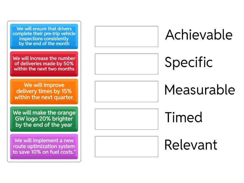 We will improve delivery times by 15% within the next quarter. - Specific, We will ensure that drivers complete their pre-trip vehicle inspections consistently by the end of the month - Measurable, We will increase the number of deliveries made by 50% within the next two months - Achievable, We will make the orange GW logo 20% brighter by the end of the year - Relevant, We will implement a new route optimization system to save 10% on fuel costs.” - Timed,