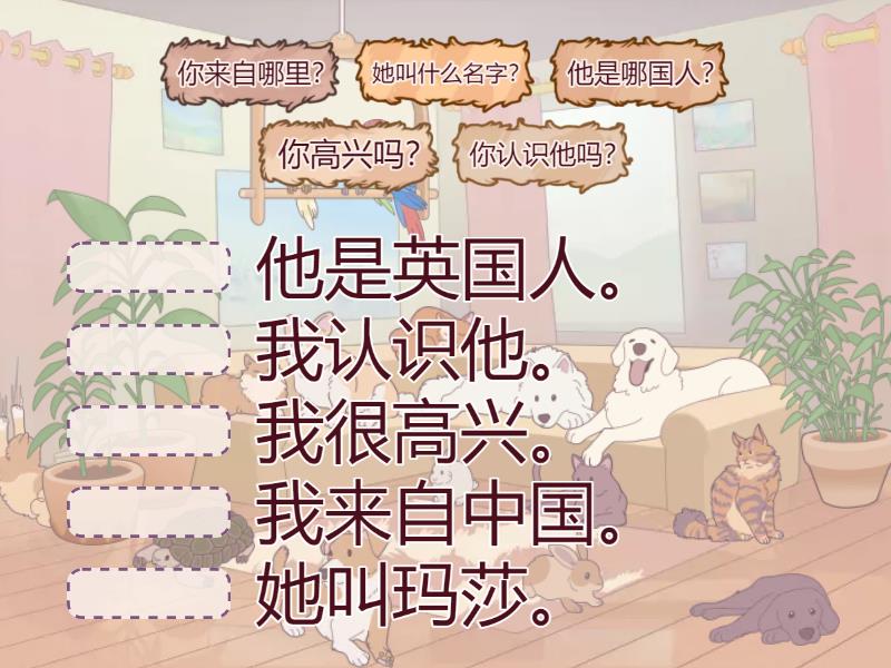 你来自哪里? - 我来自中国。, 他是哪国人? - 他是英国人。, 她叫什么名字? - 她叫玛莎。, 你高兴吗? - 我很高兴。, 你认识他吗? - 我认识他。,