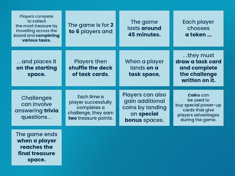 Players compete to collect the most treasure by travelling across the board and completing various tasks. - …and doing what?, The game is for 2 to 6 players and - … for how many players? , The game lasts around 45 minutes. - It lasts how long?, Each player chooses a token ... - They choose what / a what?, …and places it on the starting space. - …and places it on what / where?, Players then shuffle the deck of task cards. - They then do what?, When a player lands on a task space, - …lands on what / where? , …they must draw a task card and complete the challenge written on it. - …they must do what? , Challenges can involve answering trivia questions… - … answering what kind of questions?, Each time a player successfully completes a challenge, they earn two treasure points. - …they earn how many treasure points? , Players can also gain additional coins by landing on special bonus spaces. - …by landing on what kind of spaces. , Coins can be used to buy special power-up cards that give players advantages during the game. - What can be used to buy power-up cards …?, The game ends when a player reaches the final treasure space. - The game ends when?,