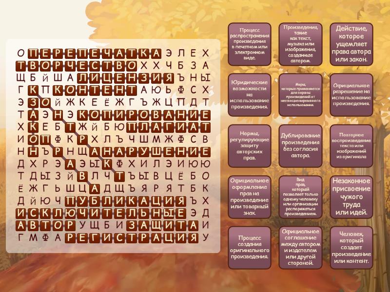 автор - Человек, который создает произведение или контент., лицензия - Официальное разрешение на использование произведения., плагиат - Незаконное присвоение чужого труда или идей., права - Юридические возможности на использование произведения., исключительные - Вид прав, который позволяет только одному человеку или организации распоряжаться произведением., контракт - Официальное соглашение между автором и издателем или другой стороной., нарушение - Действие, которое ущемляет права автора или закон., защита - Меры, которые применяются для охраны произведений от несанкционированного использования., публикация - Процесс распространения произведения в печатном или электронном виде., творчество - Процесс создания оригинального произведения., копирование - Дублирование произведения без согласия автора., перепечатка - Повторное воспроизведение текста или изображений из оригинала, регистрация - Официальное оформление прав на произведение или товарный знак., закон - Нормы, регулирующие защиту авторских прав., контент - Произведения, такие как текст, музыка или изображения, созданные автором.,