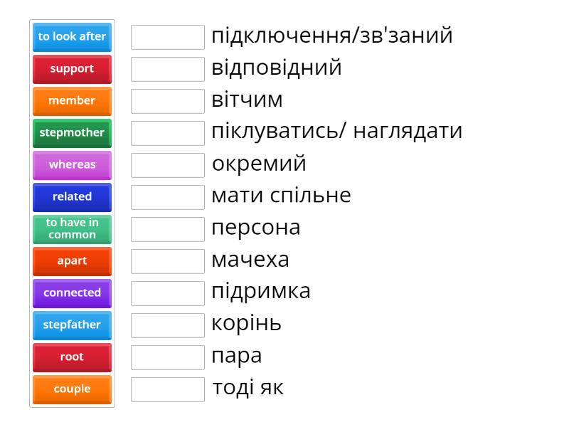 couple - пара, member - персона, root - корінь, stepfather - вітчим, stepmother - мачеха, support - підримка, connected - підключення/зв'заний, related - відповідний, apart - окремий, whereas - тоді як, to have in common - мати спільне, to look after - піклуватись/ наглядати,