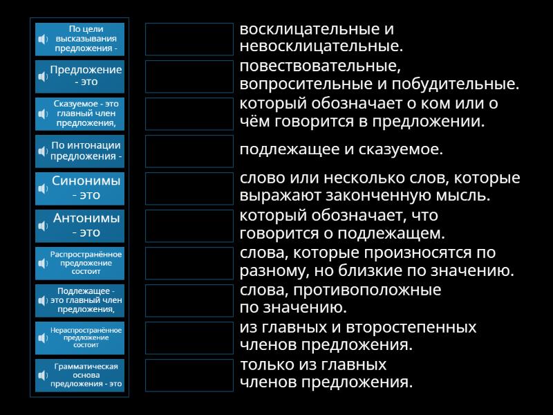 Предложение - это - слово или несколько слов, которые выражают законченную мысль., По интонации предложения - - восклицательные и невосклицательные., Грамматическая основа предложения - это - подлежащее и сказуемое., По цели высказывания предложения - - повествовательные, вопросительные и побудительные., Нераспространённое предложение состоит - только из главных членов предложения., Распространённое предложение состоит - из главных и второстепенных членов предложения., Антонимы - это - слова, противоположные по значению., Сказуемое - это главный член предложения, - который обозначает, что говорится о подлежащем., Синонимы - это - слова, которые произносятся по разному, но близкие по значению., Подлежащее - это главный член предложения, - который обозначает о ком или о чём говорится в предложении.,