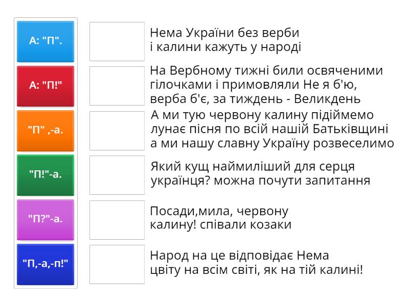 "П?"-а.  - Який кущ наймиліший для серця українця? можна почути запитання, "П!"-а.  - Посади,мила, червону калину! співали козаки, А: "П!" - Народ на це відповідає Нема цвіту на всім світі, як на тій калині!, "П,-а,-п!" - А ми тую червону калину підіймемо лунає пісня по всій нашій Батьківщині а ми нашу славну Україну розвеселимо, "П" ,-а. - Нема України без верби і калини кажуть у народі, А: "П".  - На Вербному тижні били освяченими гілочками і примовляли Не я б'ю, верба б'є, за тиждень - Великдень,