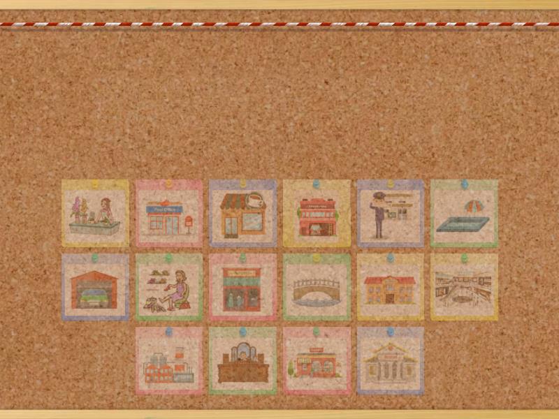 Судница, Књижара, Кафић, Школа, Продавница обуће, Пошта, Музеј, Тржни центар, Мост, Фабрика, Гаража, Цвећара, Базен, Бутик, Полицијска станица, Ватрогасци,