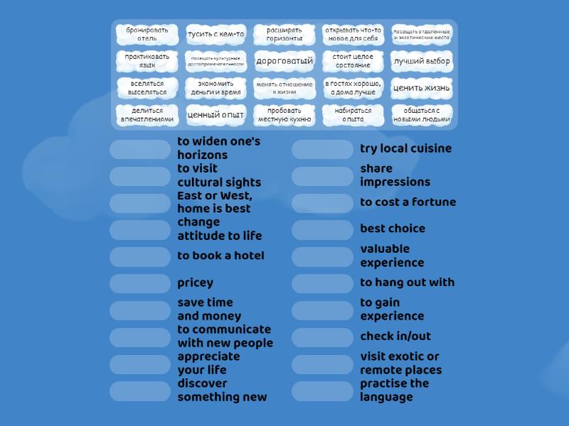 набираться опыта - to gain experience, ценный опыт - valuable experience, дороговатый - pricey, стоит целое состояние - to cost a fortune, открывать что-то новое для себя - discover something new, тусить с кем-то - to hang out with, расширять горизонты - to widen one's horizons, в гостях хорошо, а дома лучше - East or West, home is best, лучший выбор - best choice, общаться с новыми людьми - to communicate with new people, посещать культурные достопримечательности - to visit cultural sights, бронировать отель - to book a hotel, вселяться выселяться - check in/out, делиться впечатлениями - share impressions, пробовать местную кухню - try local cuisine, менять отношение к жизни - change attitude to life, практиковать язык - practise the language, ценить жизнь - appreciate your life, экономить деньги и время - save time and money, посещать отдаленные и экзотические места - visit exotic or remote places,
