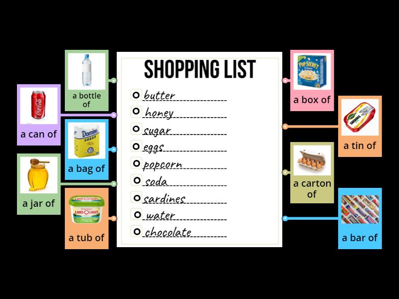 a tub of, a jar of, a bag of, a carton of, a box of, a can of, a tin of, a bottle of, a bar of.
