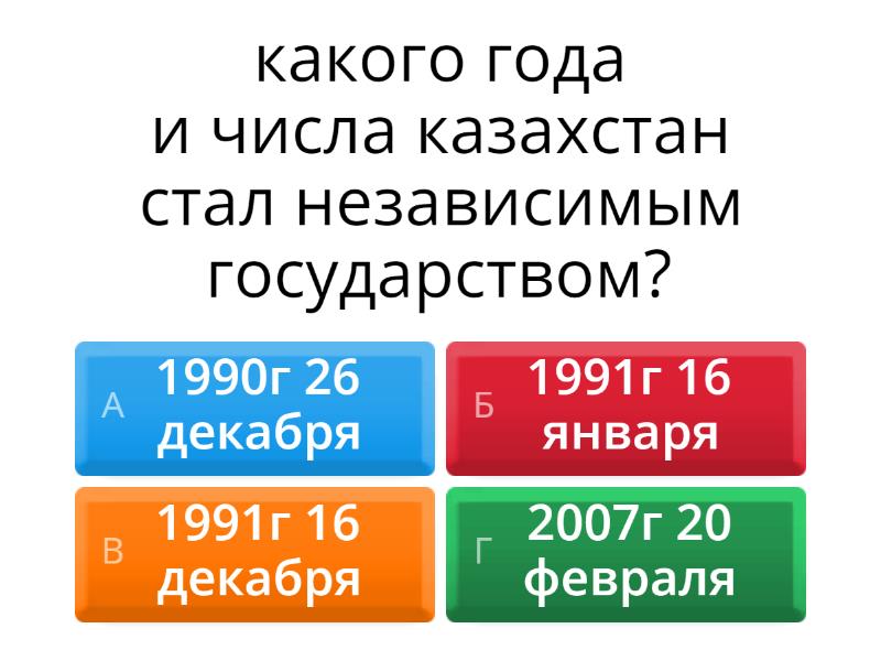 1) какого года и числа казахстан стал независимым государством? a) 1990г 26 декабря b) 1991г 16 января c) 1991г 16 декабря d) 2007г 20 февраля 2) из скольки разделов и статей состоит основной закон РК? a) 9 разделов 98 статей b) 5 разделов 98 статей c) 7 разделов 89 статей d) 6 разделов 89 статей 3) какие сроки президентской власти a) 7 лет b) 2 года c) 5 лет d) 3 года 4) правое государство это a) власть государства которая не ограниченным правом b) власть государства ограниченным правом c) основной закон d) совокупность политических организаций 5) какого числа действует закон о порядке организаций a) 25 мая 2020г b) 26 мая 2020г c) 20 мая 2020г d) 16 мая 2022г