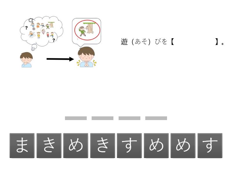 します - スピーチを【      】。, なります - チャイムが【      】。, つたえます - みんなに今日(きょう)の予定(よてい)を【      】。, うたいます - 歌(うた)を【      】。, きます - 先生(せんせい)が教室(きょうしつ)に【      】。, あります - 体育(たいいく)が【      】。, きめます - 遊(あそ)びを【      】。,