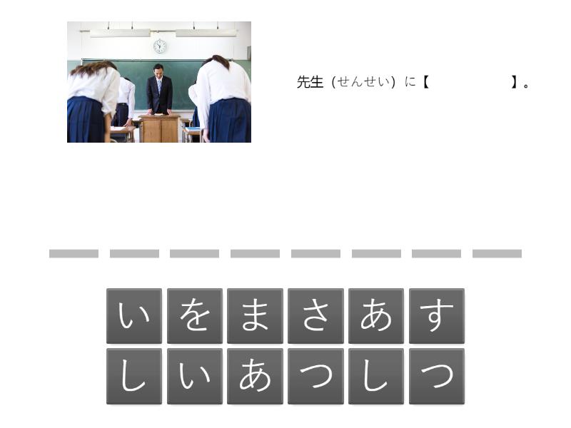 いきます - 音楽室(おんがくしつ)に【      】。, べんきょうします - 英語(えいご)を【      】。, いどうします - 体育館(たいいくかん)に【      】。, よういをします - 帰(かえ)りの【      】。, おわります - 授業(じゅぎょう)が【      】。, あいさつをします - 先生(せんせい)に【      】。, ならびます - 1列(れつ)に【      】。, かえります - 家(いえ)に【      】。,