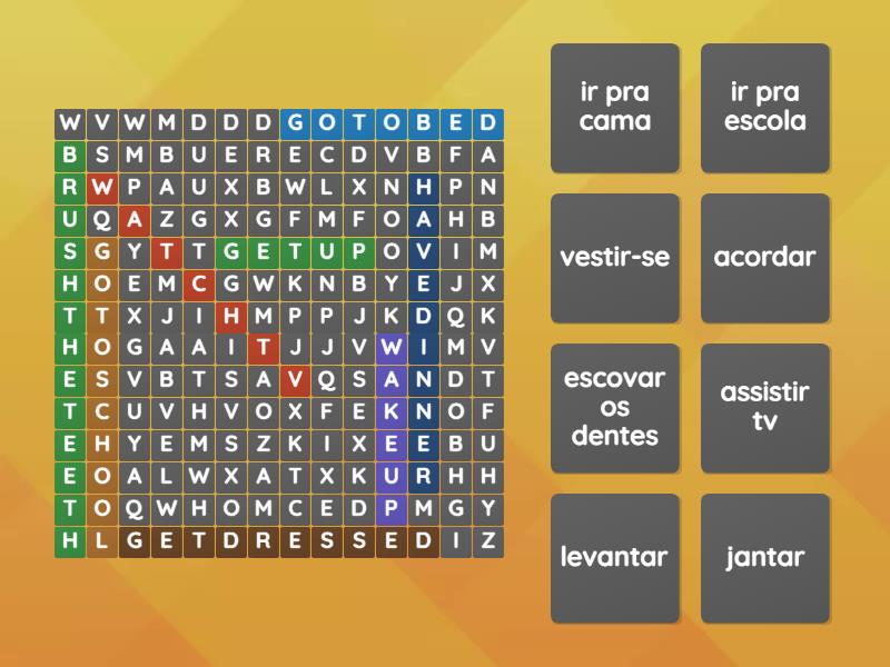 get up - levantar, wake up - acordar, watch tv - assistir tv, go to bed - ir pra cama, get dressed - vestir-se, have dinner - jantar, go to school - ir pra escola, brush the teeth - escovar os dentes,