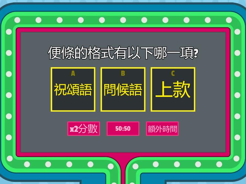 1) 便條的格式有以下哪一項? a) 祝頌語 b) 問候語 c) 上款 2) 以下哪一項是便條的內容特點? a) 比較詳細 b) 比較簡短 c) 不知道 3) 以下哪一項是便條的格式特點? a) 祝頌語 b) 問候語 c) 書寫時間 4) 便條的特點有以下哪一項? a) 內容豐富,要多於一段 b) 內容精簡,只得一段 c) 要畫圖 5) 如果我想通知老師我忘記帶書,日後才歸還,應選擇以下哪個文體? a) 書信 b) 便條 c) 不知道