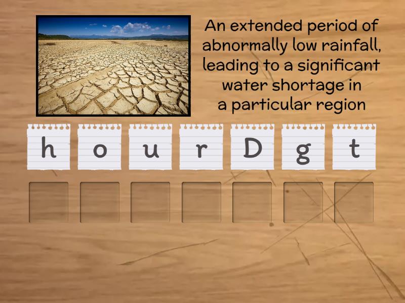 Drought - An extended period of abnormally low rainfall, leading to a significant water shortage in a particular region, Hurricane - strong winds, heavy rainfall, and organized thunderstorms are characteristics of this natural disaster , Flood - Overflow of water onto normally dry land, which can occur due to various natural factors such as heavy rainfall, Avalanche  - Rapid flow of snow and ice down a mountainside, Volcanic Eruption  - the process by which magma from beneath the Earth is expelled to the surface, often resulting in the discharge of lava and gas, Tsunami - A series of large ocean waves caused by a significant disturbance or displacement of water, most commonly resulting from underwater earthquakes, Tornado - A rapidly rotating column of air that extends from a thunderstorm to the ground, Earthquake - The shaking of the Earth's surface caused by the sudden release of energy in the tectonic plates , Landslide - The downward movement of rock and soil due to gravity. They often happen in hilly or mountainous areas,