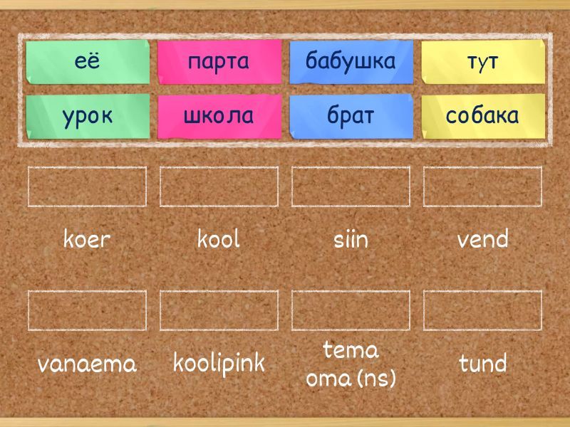 школа - kool, карандаш - pliiats, парта - koolipink, пeнал - pinal, сумка - kott, стул - tool, урок - tund, cуббота - laupäev, тyт - siin, брат - vend, бабушка - vanaema, дедушка - vanaisa, собака - koer, его - tema oma (ms), её - tema oma (ns), их - nende oma,