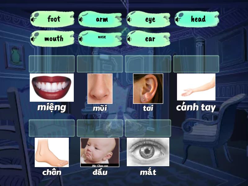 eye - mắt, ear - tai, head - đầu, nose - mũi, mouth - miệng, arm - cánh tay, foot - chân,