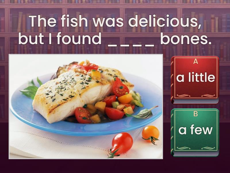1) The fish was delicious, but I found ____ bones. a) a little b) a few 2) A good diet can prevent _____ illnesses. a) too much b) a lot of 3) That ring is too expensive. I don't have ___________ money. a) a lot of money b) too many 4) We have _________ milk to drink. a) some b) a few 5) They sometimes drink _________ soup. a) a few b) a little 6) There are ___________ oranges in the fridge. a) a lot of b) too much 7) She spends _____ money on shoes. a) too much b) too many 8) You don't do _____ exercise. a) a lot of b) too many 9) _______ chocolates isn't good for you. a) Too many b) Too much 10) ______ hours do you study a day? a) How much b) How many 11) Don't spend _____ time on the computer. a) too much b) too many 12) We're buying _____ things for our new flat. a) a few b) a little 13) He does __________ housework every day. a) a few b) a little