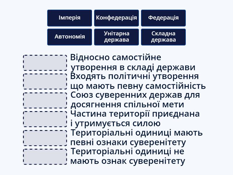 Унітарна держава - Територіальні одиниці не мають ознак суверенітету, Складна держава - Територіальні одиниці мають певні ознаки суверенітету, Федерація - Входять політичні утворення що мають певну самостійність, Конфедерація - Союз суверенних держав для досягнення спільної мети, Імперія - Частина території приєднана і утримується силою, Автономія - Відносно самостійне утворення в складі держави,