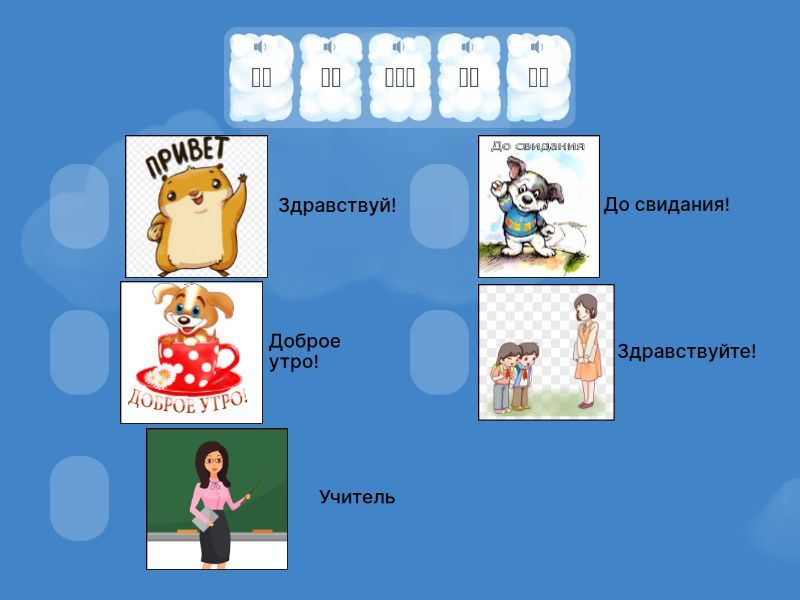 老师 - Учитель , 您好! - Здравствуйте!, 您早 - Доброе утро!, 你好 - Здравствуй! , 再见 - До свидания!,