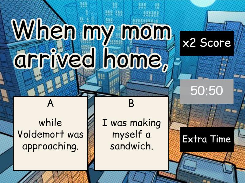 1) When my mom arrived home, a) while Voldemort was approaching. b) I was making myself a sandwich. 2) What are the suffixes for the present continuous tense? a) ED b) IED c) ES d) S e) IES f) ING 3) Dumbledore took out his wand a) while Voldemort was approaching. b) when the fire under the cauldron died. 4) They are --------------------football now. a) play b) playing c) plaies d) plays e) layed f) played 5) I and my family ....... having fun at the open-air concert. a) was b) wasn't c) had d) were 6) I___________________________(use) headphones at the moment. a) is using b) are used c) use d) am using 7) I .... ....... a leather jacket, but the coat. a) was wearing b) weren't wearing c) wearing d) wasn't wearing e) was holding 8) change into negative sentences. (+) They are climbing the mountain. a) They is not climbing the mountain. b) They am climbing the mountain c) They are not climbing the mountain d) they climbing the mountain. 9) Th girl ...... ........ the souvenirs at the souvenir stall. a) was selling b) were selling c) was buying d) sold e) hasn't got 10) change into question sentence (-) I am not cleaning my room. a) Am I Cleaning my room? b) am I clean my room? c) is I cleaning my room? d) Are I cleaning my room? 11) I ___________ (have) lunch when I _____ Chris, my childhood friend. a) having/seeing b) was having/seeing c) was having/saw 12) _____ Riya _______(play) computer games at the moment? (Interrogative) a) Did/ play b) Do/ playing c) Does/ plays d) Is/playing