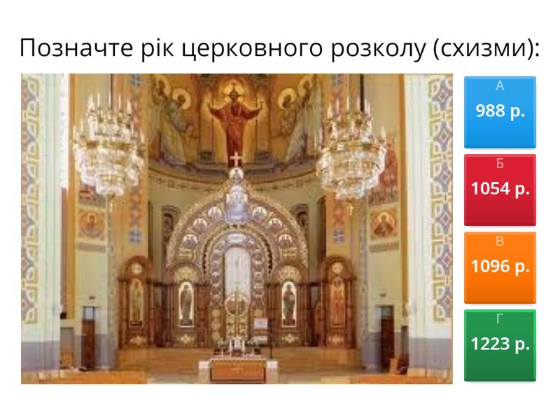 1) Позначте рік церковного розколу (схизми): a) 988 р. b) 1054 р. c) 1096 р. d) 1223 р. 2) Розподіл на правителів і підлеглих - це: a) схизма b) ієрархія c) собор d) таїнство 3) Вкажіть кількість таїнств у релігійній обрядовості a) 5 b) 6 c) 7 d) 8 4) Який церковний діяч проголосив церкву єдиним посередником між Богом і людьми? a) Григорій І Великий b) Григорій VII c) Генріх IV d) Аврелій Августин 5) Чи є сьогодні єдиний глава правослоавної церкви у світі? a) так b) ні 6) Хто є головою римо-католицької церкви? a) Папа Римський b) Константинопольський патріарх c) Київський митрополит d) Апостол Петро 7) Ікони, написані за спеціальними чітко визначеними правилами, притаманні: a) православній церкві b) римо-католицькій церкві 8) У якій церкві виконують музику на оргАні? a) православній b) римо-католицькій 9) Чому церква у Середньовіччі накопичила незліченні багатства? a) королі здійснювали щедрі дарування церкві b) королі звільняли церкву від сплати податків c) посади у церковній ієрархії продавалися d) все вищезазначене вірно 10) Що означає вислів "піти у Каноссу"? a) піти на принизливі поступки b) піти у далеку подорож по святих місцях c) піти на молитву d) піти на сповідь 11) Хто вище за церковною ієрархією? a) кардинал b) єпископ c) ченець 12) Головний храм римо-католицької церкви - це: a) Києво-Печерська лавра у Києві b) Софійський собор у Константинополі c) Єрусалимський храм d) Собор Святого Петра у Римі